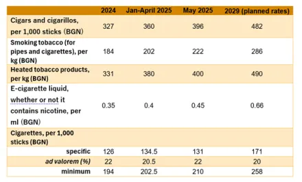In March 2025, amendments to the Excise Duties and Tax Warehouses Act increased excise rates on all tobacco products (State Gazette, Issue 26/27.03.2025; with rates effective as of 1 May 2025). Compared to 2024, the new schedule represents an 8.25% increase in minimum cigarette excise tax. By 2029, the minimum excise duty on cigarettes should rise to BGN 258 (EUR 131.90) per 1,000 cigarettes. The specific component of the cigarette excise for 2025 remains largely unchanged, yet the ad valorem excise duty is set higher than initially proposed.