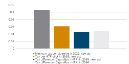 Figure 1 / Minimum tax per cigarette, tax per HTP stick and tax differences – new act vs 2024 (EUR)